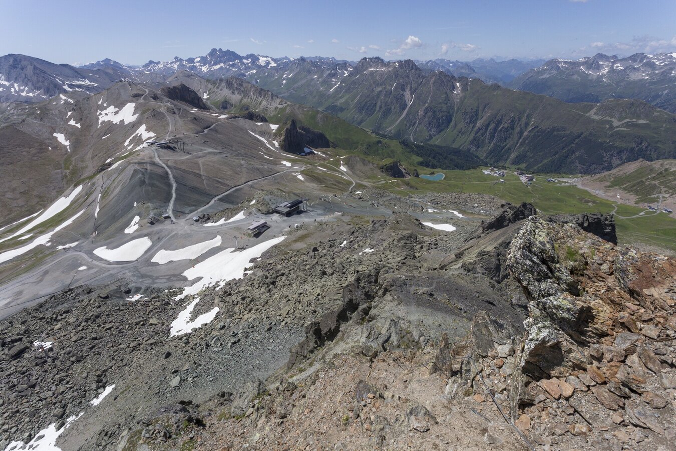 Variante ohne Lifte: Rund um den Mullersattel führen die Wegweiser Richtung Flimjoch auf 2.757 m. Ab dem Flimjoch geht es bergab, über die obere Velillalpe auf 2.061 m führen markierte Wege, Fahrwege und Pistenabschnitte hinunter ins Tal nach Ischgl.