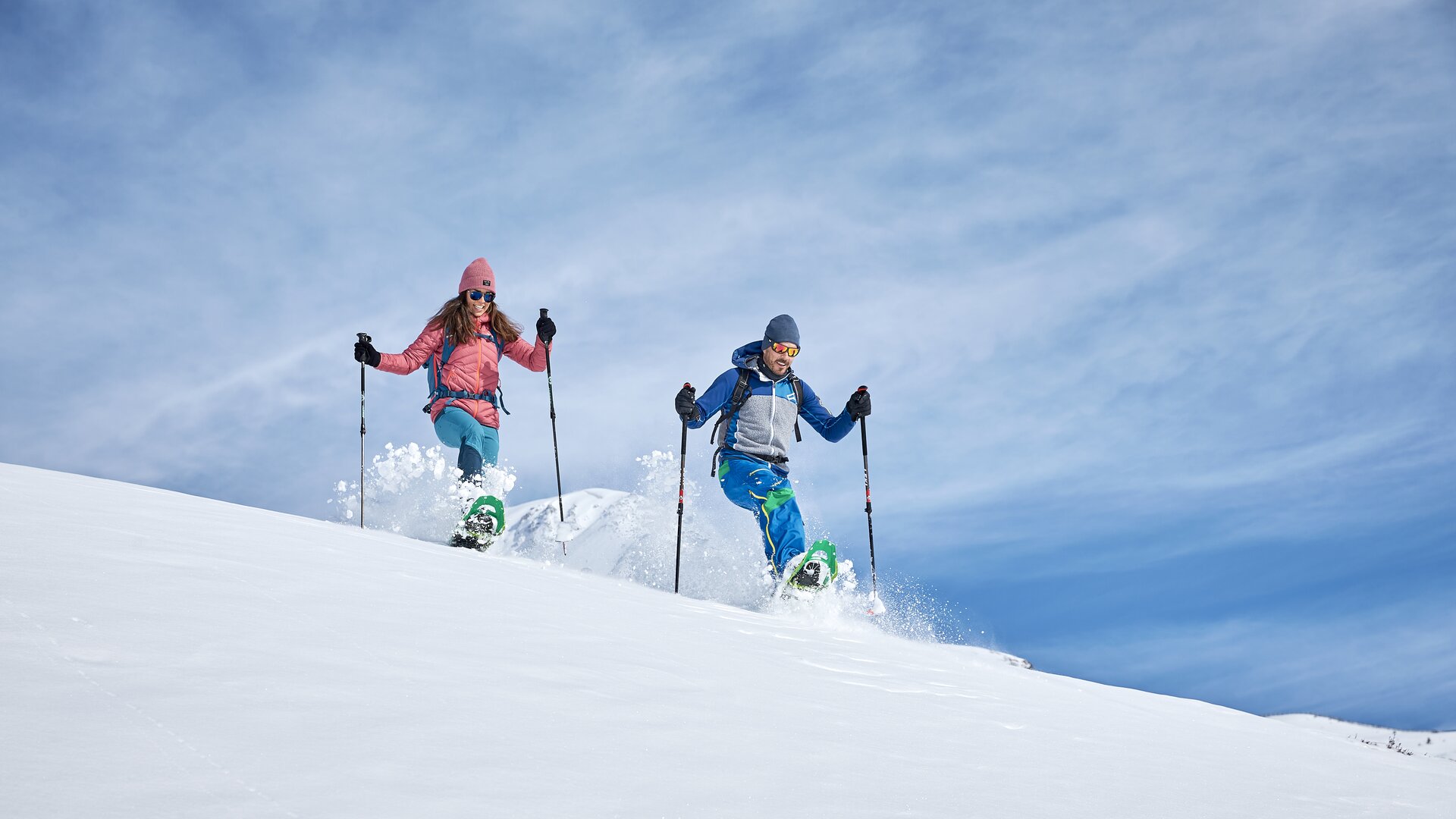 Keine eigenen Schneeschuhe? Dann leihe dir vor Ort die passende Ausrüstung aus, und gehe mit den Profis auf Erkundungstour!